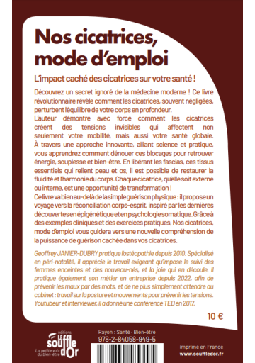 Découvrez un secret ignoré de la médecine moderne ! Ce livre révolutionnaire révèle comment les cicatrices, souvent négligées, perturbent l’équilibre de votre corps en profondeur. L’auteur, ostéopathe avec plus de 10 ans d’expérience et des milliers de consultations à son actif, démontre avec force comment les cicatrices créent des tensions invisibles qui affectent non seulement votre mobilité, mais aussi votre santé globale.