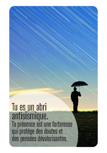 Les cartes Bons Mots vous emmènent faire un tour sur les chemins ensoleillés de votre personnalité. Là, une vision élevée révèle les qualités, les bénédictions, les louanges qui parent de la plus belle décoration : l’estime de soi. Ce sont vos titres, vos lettres de noblesse. En prendre conscience et les accepter les fait s’épanouir. Les offrir les fait se multiplier. Chaque jour, tirez ou offrez une carte et laissez-vous imprégner du message qu’elle adresse. N’hésitez pas à la photographier ou à la garder sur vous pour vous en inspirer tout au long de la journée. Elle agira comme un rempart face à l’adversité, la malveillance, les pensées parasites. Elle sera comme une bonne nouvelle venue d’en haut, au milieu de toutes les mauvaises dispensées par les médias.